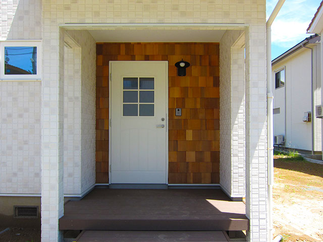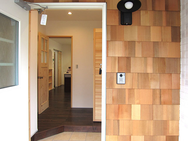 玄関入り口にアクセントに椋(ムク)の木の板を使用しました。