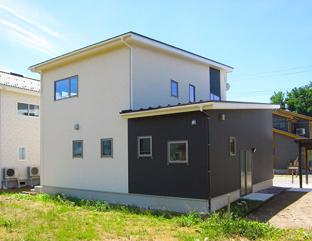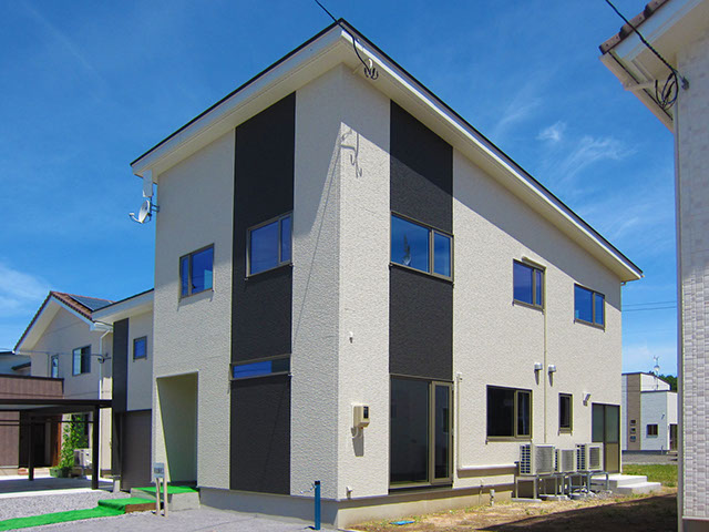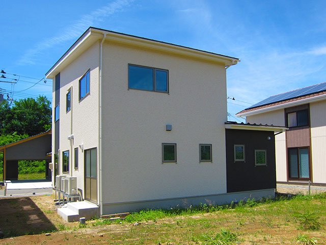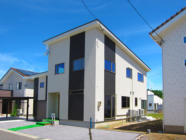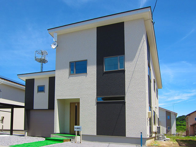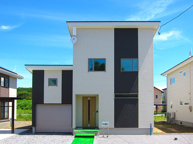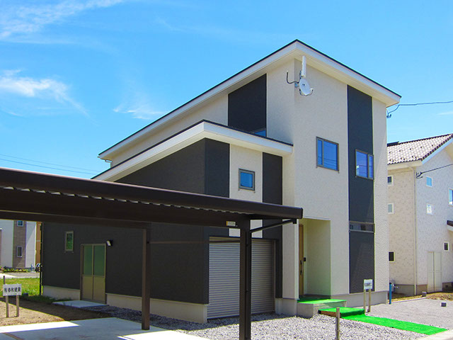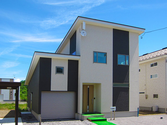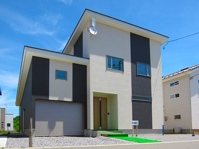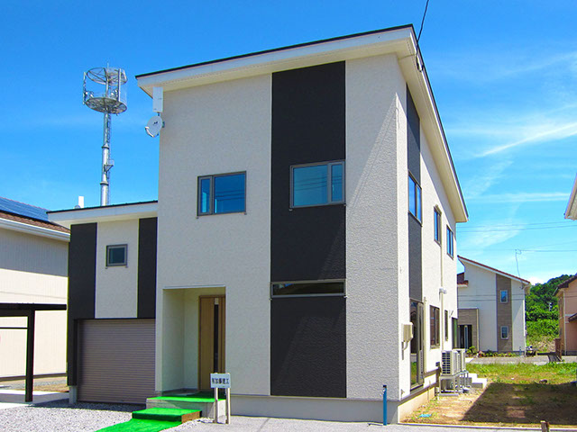 屋根は平板瓦の明るい色合いに仕上げ、外壁は2種類の外壁材を張り分け、飽きの来ないシンプルモダン的なデザインに仕上げてあります。