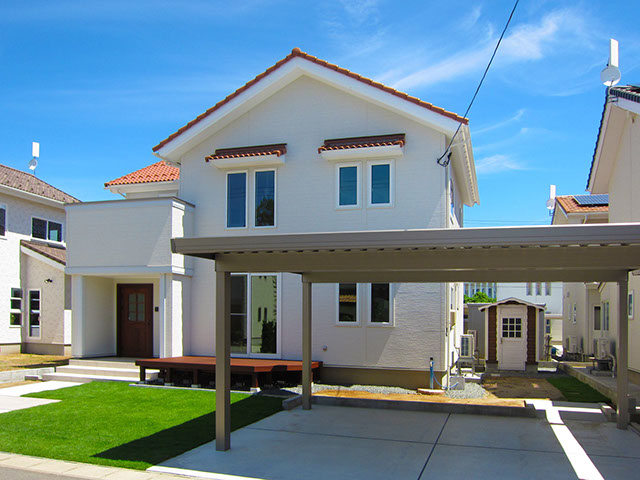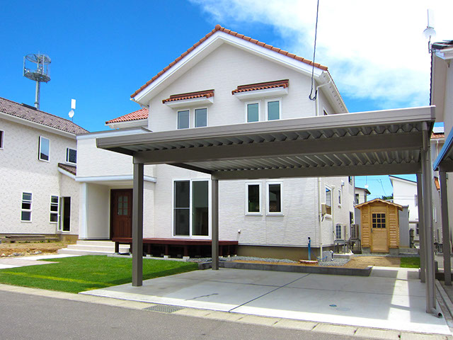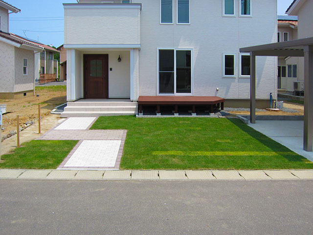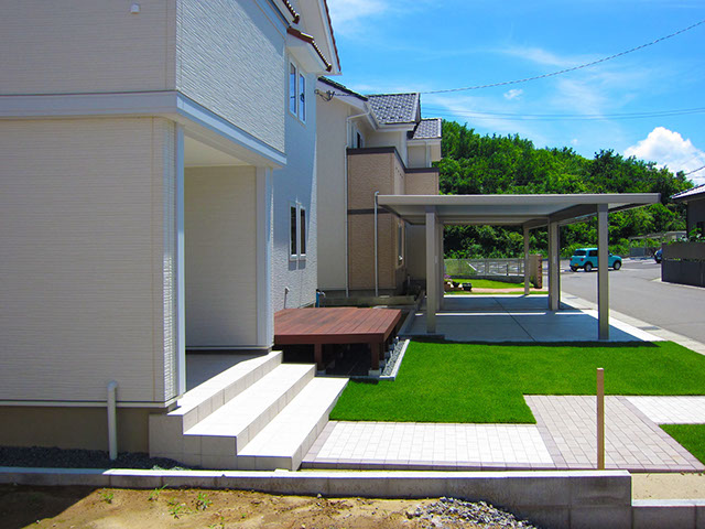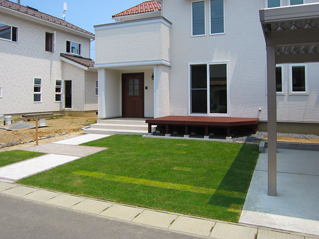 芝のある広い庭は景観への配慮とともに、コンクリートなどに比べ熱をため込みません。