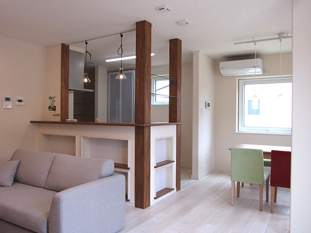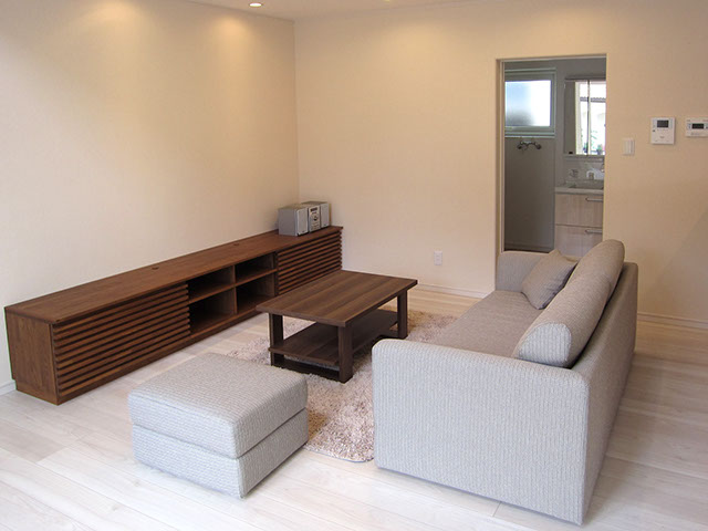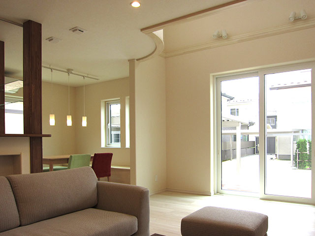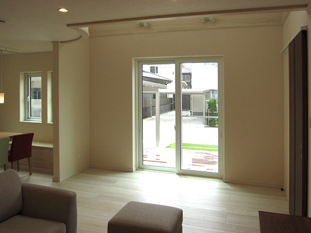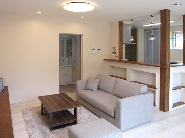 白ベースのリビング。住宅全体にも使われるトキワ「マッスルウォール」がリビング全体をパワフル消臭。