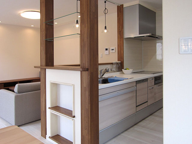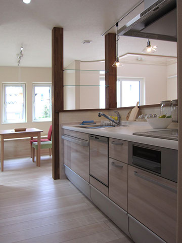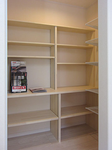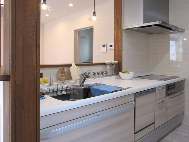 背面収納にパントリーと収納スペースを広く取ったキッチン。水音のしにくいキッチンシンクはリビングでのくつろぎを邪魔しません。