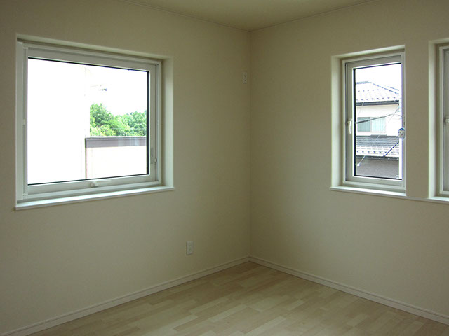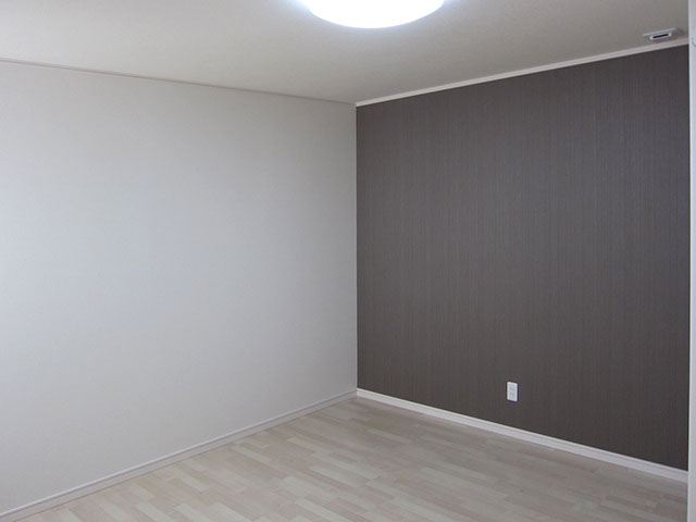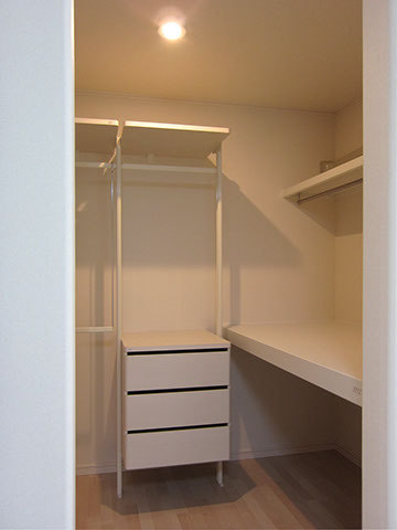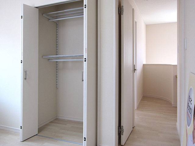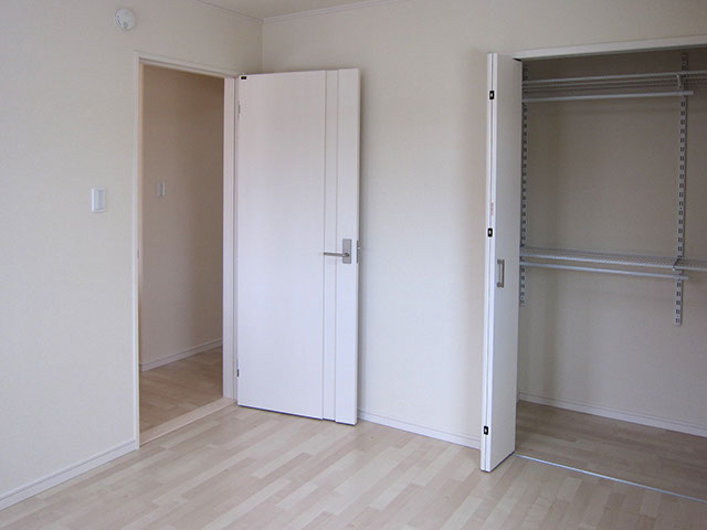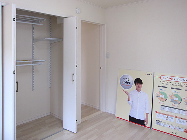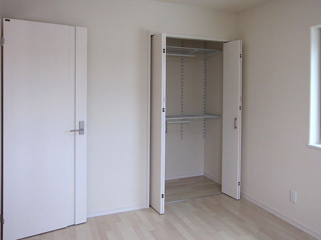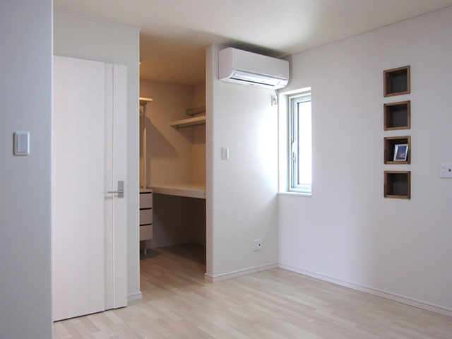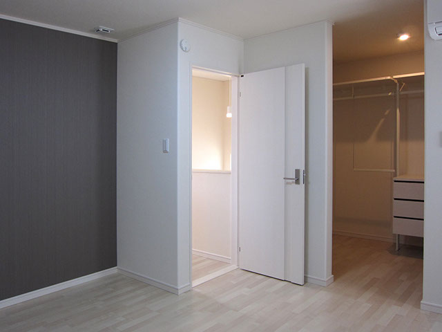 広い収納のある寝室。壁掛けTVにも対応したコンセントの位置など、細かな作りが自慢です。