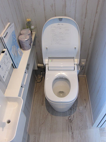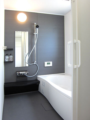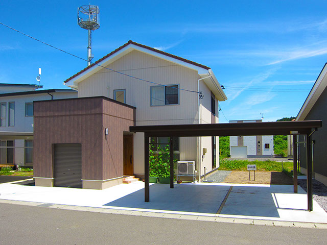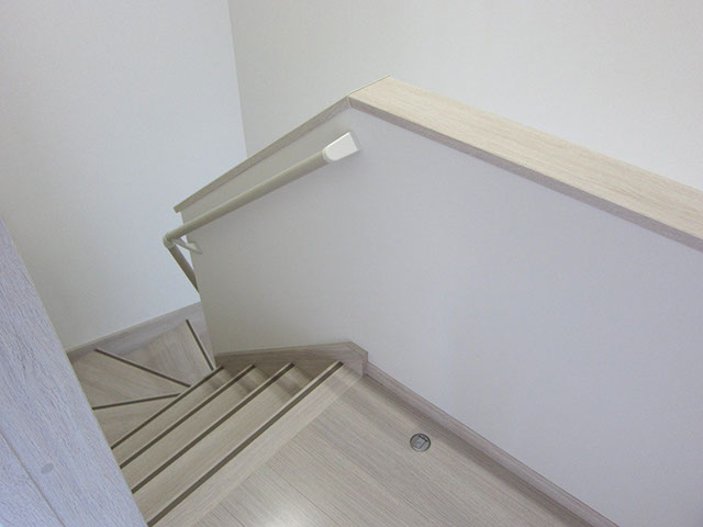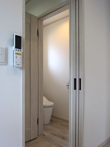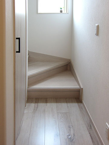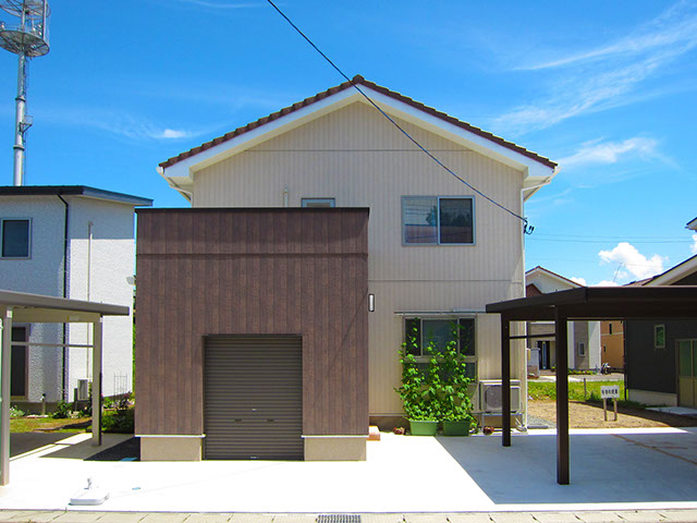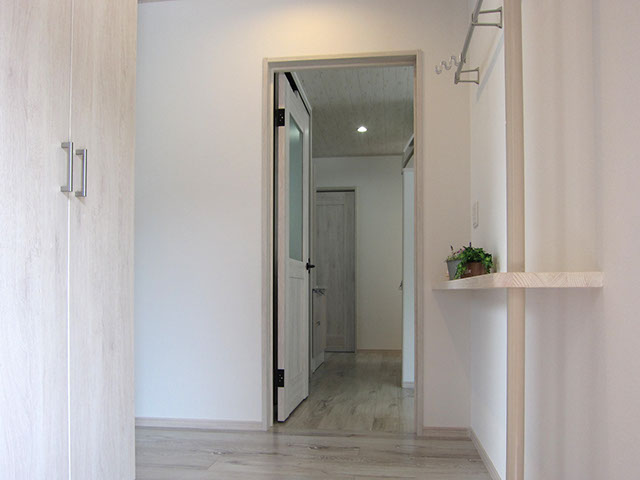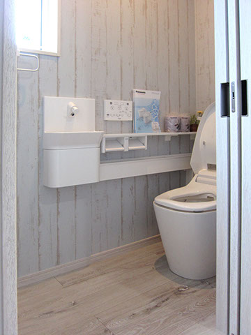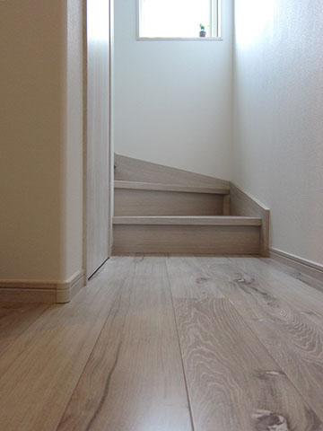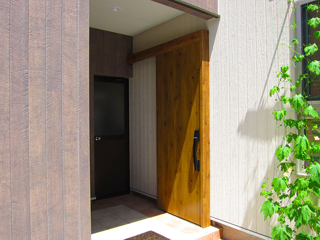 ホワイトベースの木目柄にポイントでブラウンの木目柄を組み合わせて外観を引き締めています。