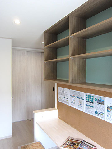 2階にデスクスペースを設置、壁面には大容量の収納棚。